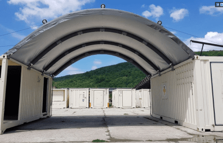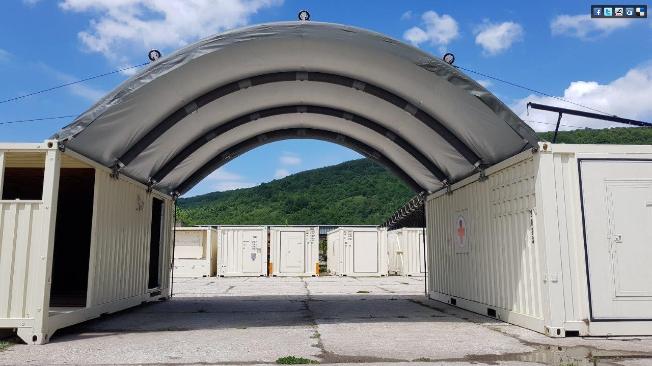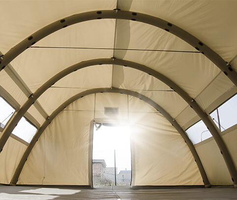 Supported by inflatable columns and reinforced by longitudinal inflatable tubes or aluminium purlins on the top of the roof, the structure of the PRO is made of heavy duty seamless pneumatic tubes of 6’ (150 mm) diameter with a working pressure in tubes of between 4-8 bar (60–120 psi), the minimum (collapse) pressure is 1.5 bar. With such a wide pressure range, PRO shelters are the first choice for use in the harshest conditions being able to withstand extreme cold areas, high snow load, strong wind and tropical heat.